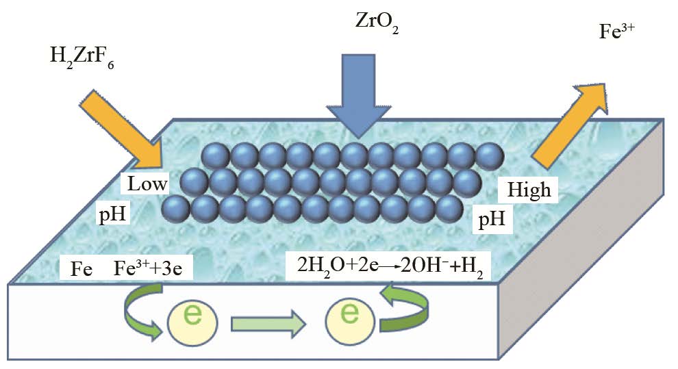 曹獻龍等研究者在《鋼鐵表面純鋯鹽轉(zhuǎn)化膜技術(shù)研究現(xiàn)狀與進展》[1]一文中報道:在前處理過程中,氟鋯酸或鋯鹽在促進劑、調(diào)整劑配合下,與金屬基材直接反應,生產(chǎn)的二氧化鋯膜層覆蓋在金屬基材表面,達到防腐的目的。主要反應過程如下: